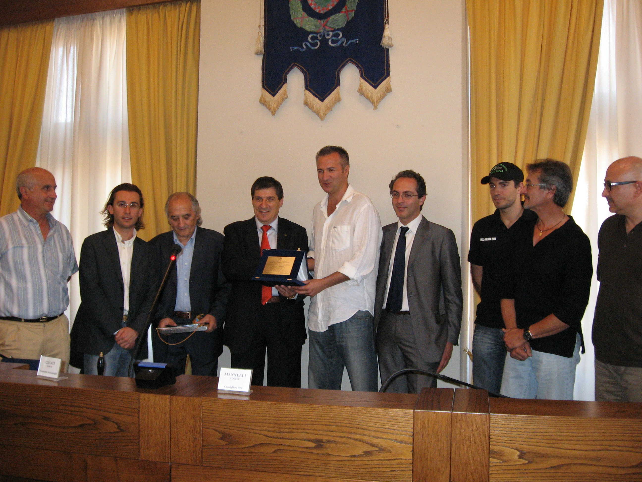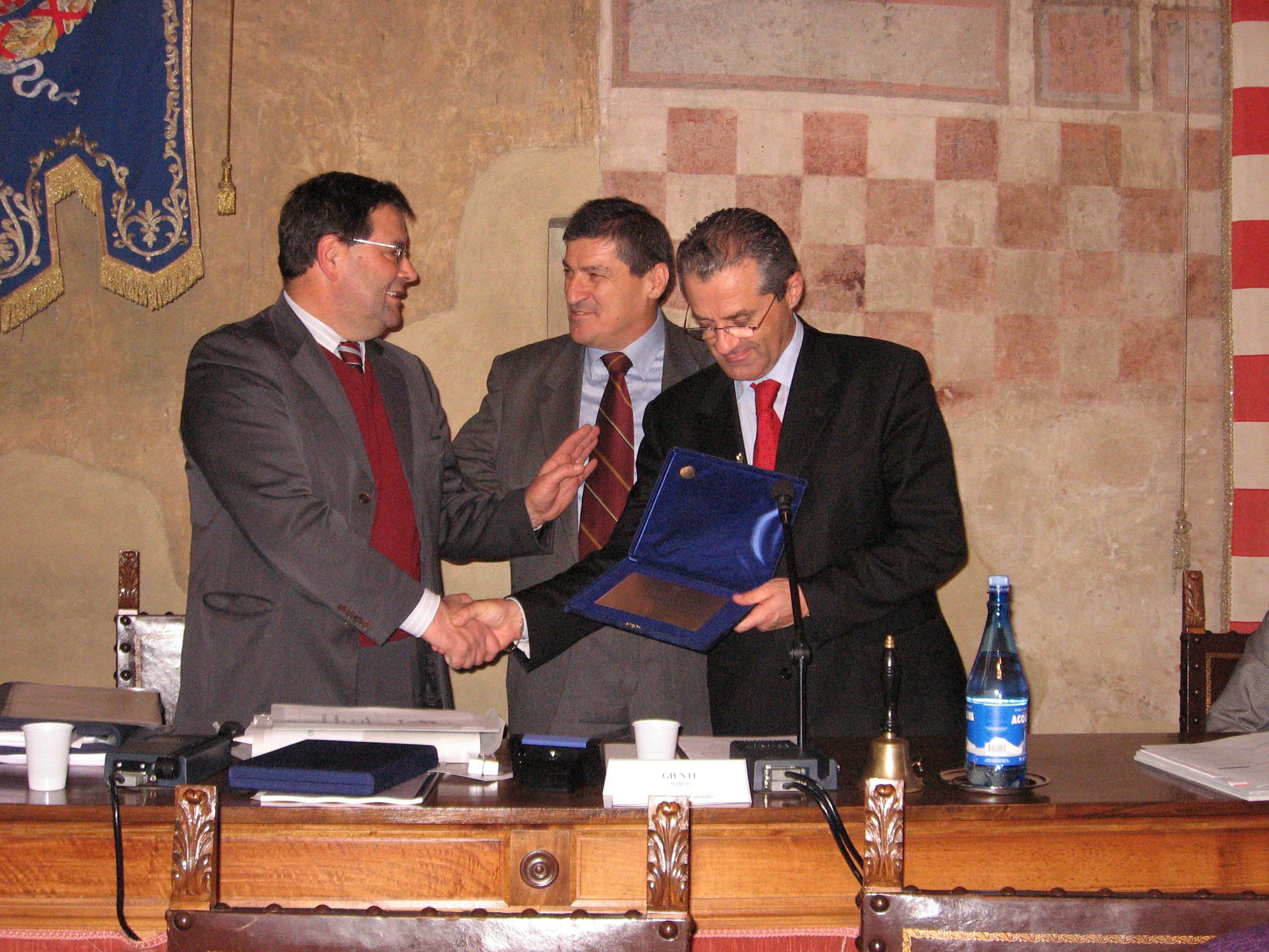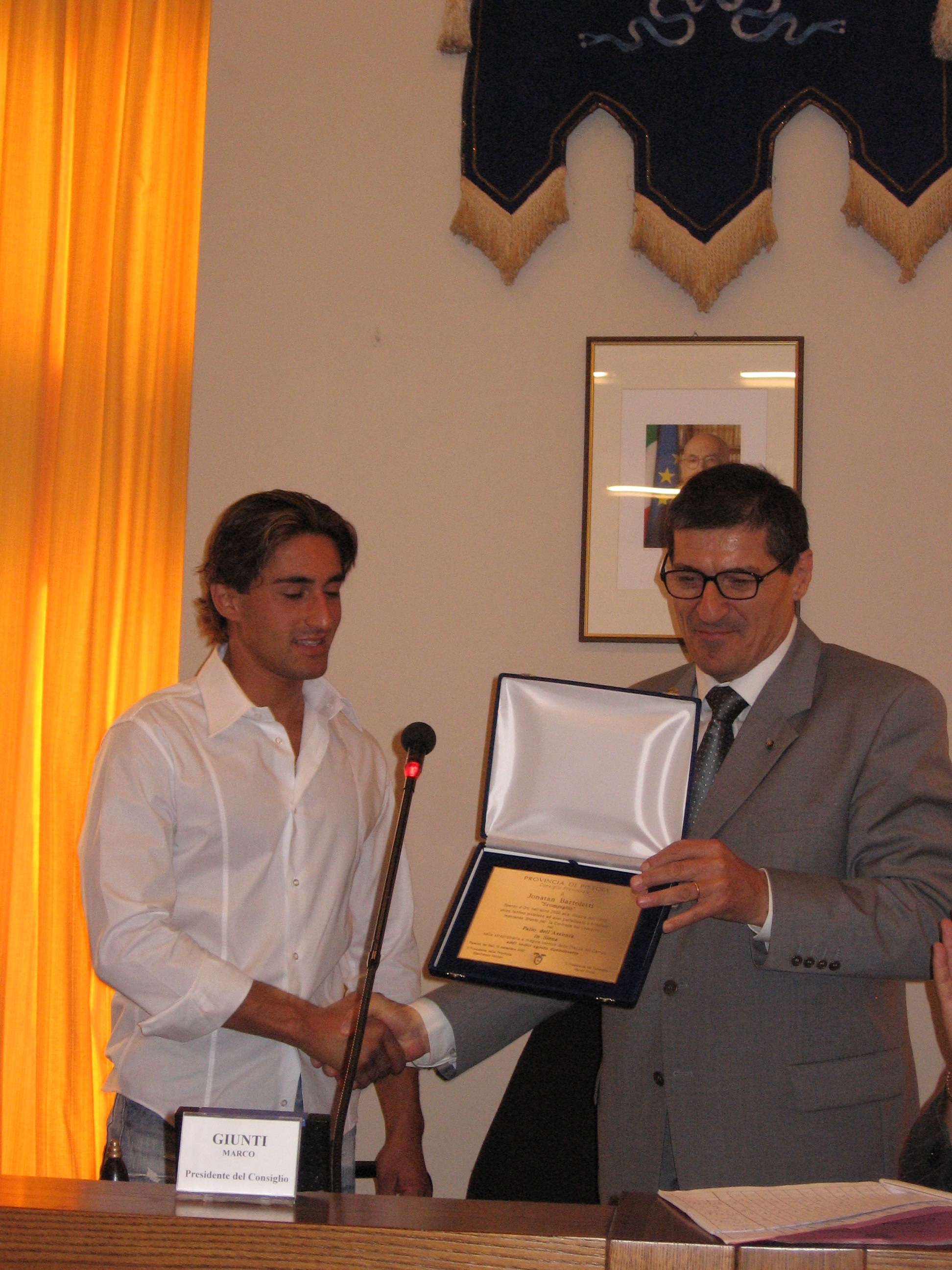 | 25 settembre 2007 Il Presidente del Consiglio Marco Giunti consegna una targa d'onore a Jonatan Bartoletti, vincitore del Palio di Siena |